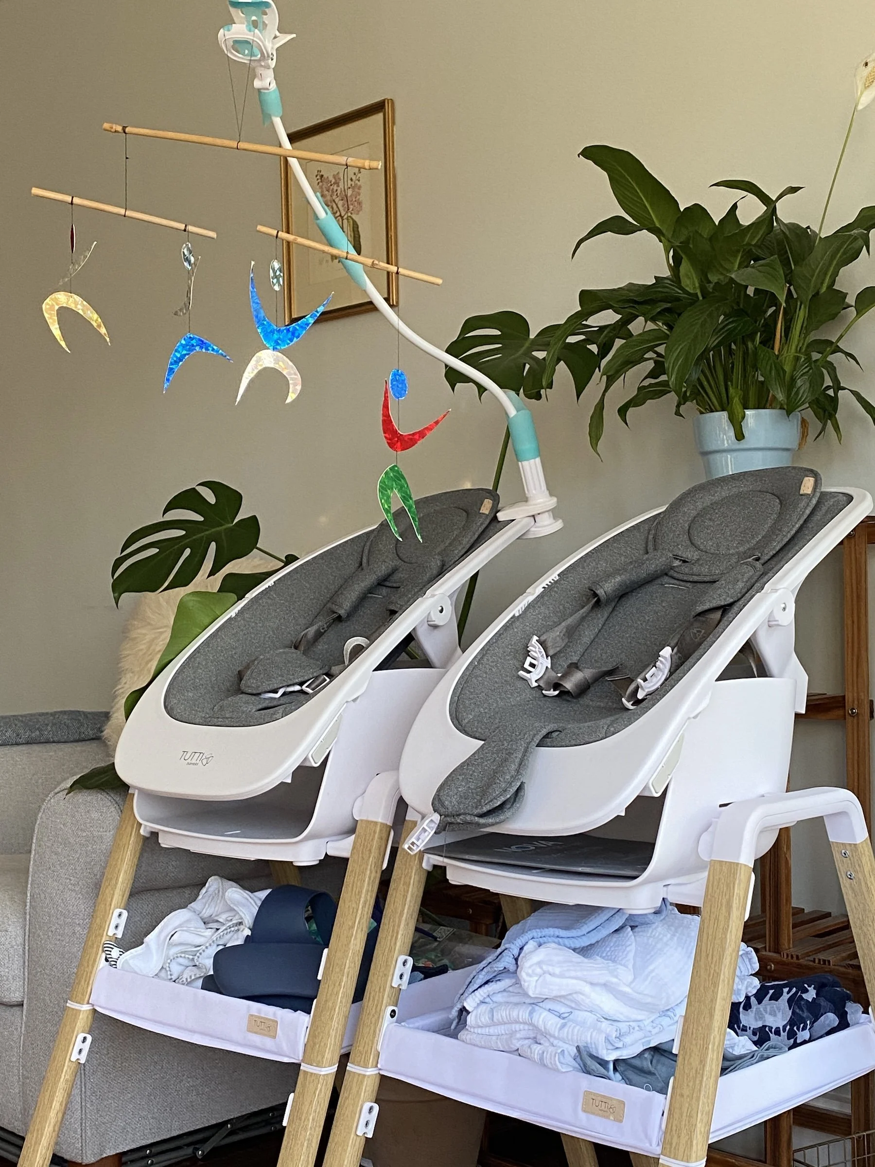 I will do a separate post on these chairs, but in short they saved my back! Once the twins were large enough, I used to put them in the 0-6 month chairs and feed them their bottles. Being able to stand rather than hunch over to feed them made such a difference for my back. More importantly, it kept my baby with reflux at a great angle for feeding and digesting. They were also great high chairs once I started weaning the babies.